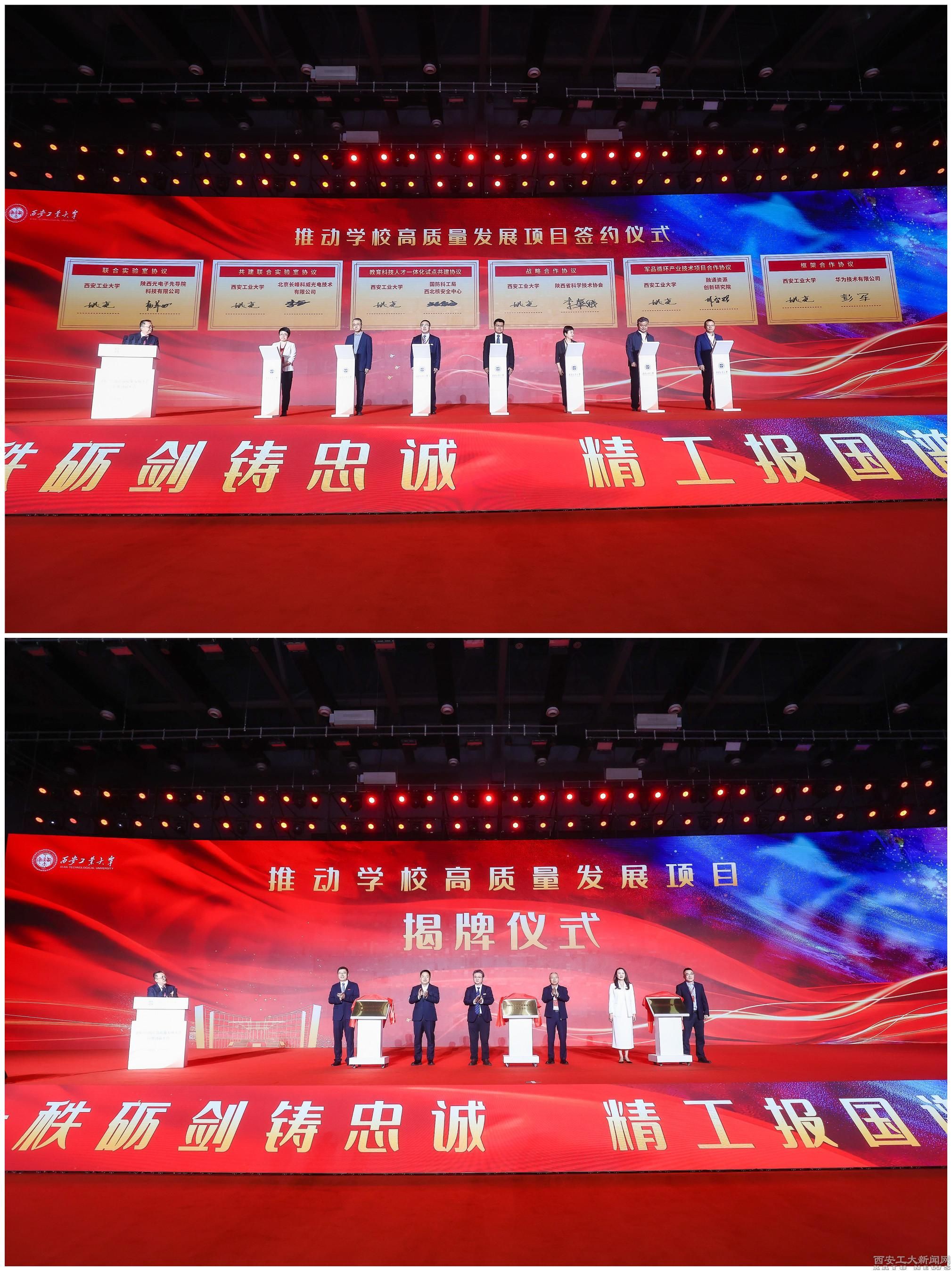 在推动学校高质量发展项目签约揭牌仪式环节,学校分别与陕西省科学技术协会、陕西光电子先导院科技有限公司等签署了合作协议,与中国兵工学会、中国兵器工业集团北方投资有限公司、西安市未央区人民政府分别为“中国兵工学会新能源装备专业委员会”“卓越工程师学院”“秦创原·西安未央四链融合示范基地”揭牌。