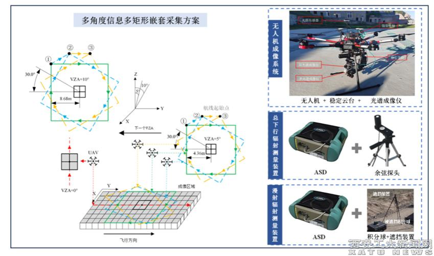 为实现复杂观测几何下地表双向反射分布函数(BRDF)的高精度建模,团队创新设计了“多矩形嵌套飞行”策略,以实现对0°~25°观测天顶角范围内、间隔5°的多角度数据采集。每一观测天顶角对应一套包含三个嵌套矩形的航线,每个矩形边长相等,相邻矩形间夹角30°,可完整覆盖0°~360°方向的12组观测方位角信息。在每个天顶角下,飞行高度与横向偏移根据角度调整,确保成像方向始终朝向目标区域。该方法结合高机动性无人机平台与稳定角度控制系统,显著提升了BRDF多角度数据采集的效率。