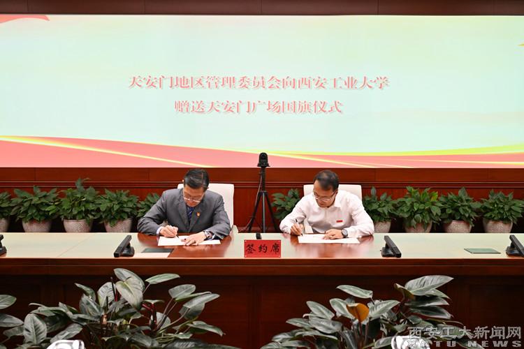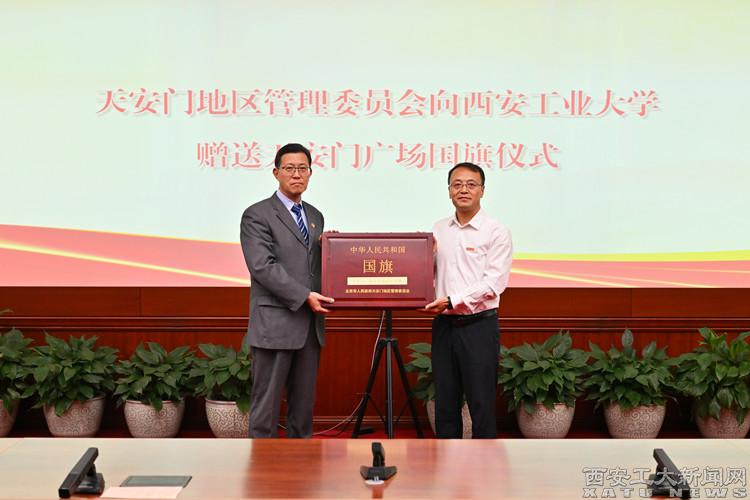 5月23日下午,赠送天安门广场国旗仪式在北京市人民政府天安门地区管理委员会举行,天安门地区管理委员会党组成员、副主任(正局长级)姚辉向学校赠送国旗,校党委副书记马福代表学校迎请国旗,双方签订《国旗赠予协议》。我校获赠国旗编号为“2006-0148”,旗长5米、高3.3米,于2006年4月21日在天安门广场升挂,当天是我校更名为乐动(中国)暨建校51周年纪念日。