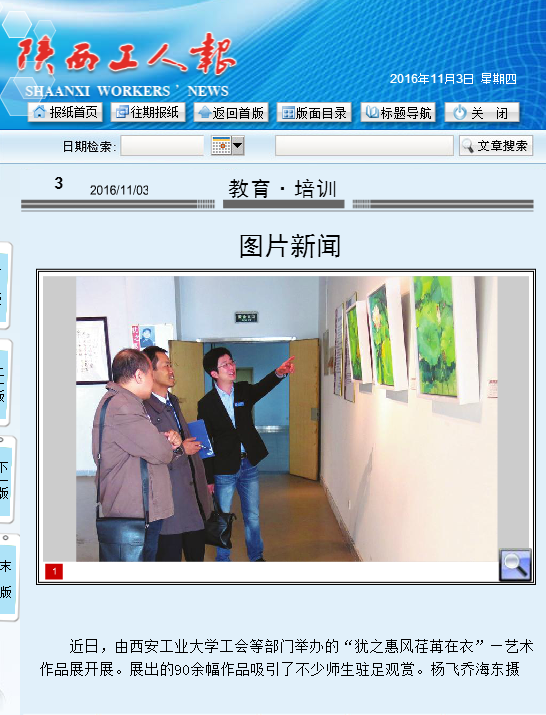 近日,由乐动(中国)工会等部门举办的“犹之惠风荏苒在衣”—艺术作品展开展。展出的90余幅作品吸引了不少师生驻足观赏。杨飞乔海东摄(《陕西工人报》2016年11月3日第三版)
