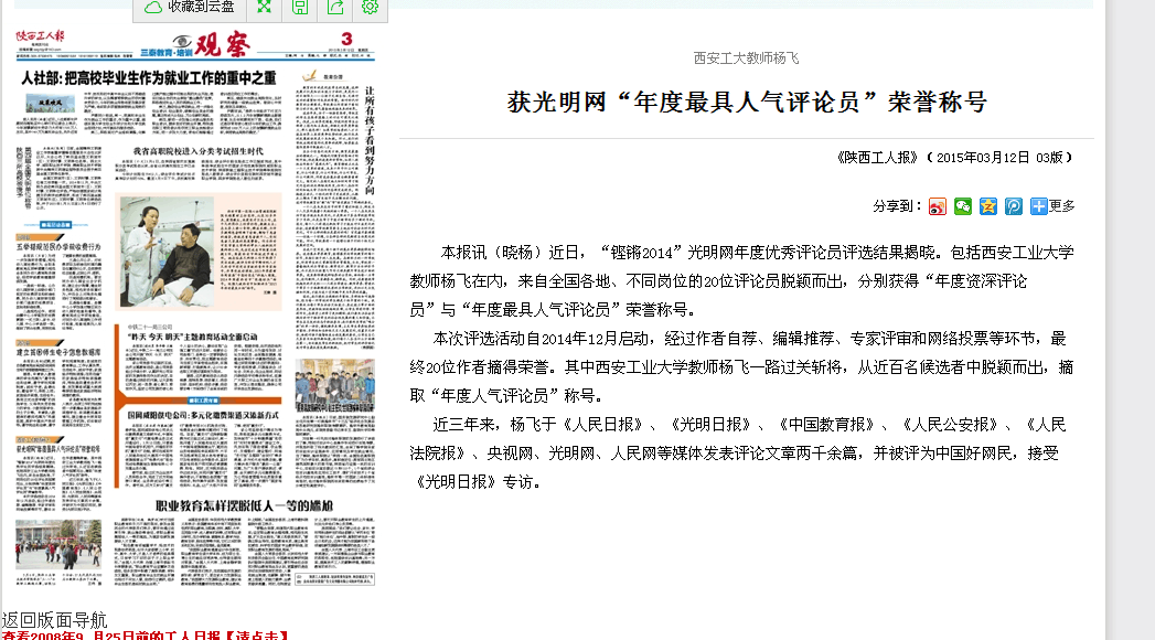 近三年来,杨飞于《人民日报》、《光明日报》、《中国教育报》、《人民公安报》、《人民法院报》、央视网、光明网、人民网等媒体发表评论文章两千余篇,并被评为中国好网民,接受《光明日报》专访。(20150312《陕西工人报》)