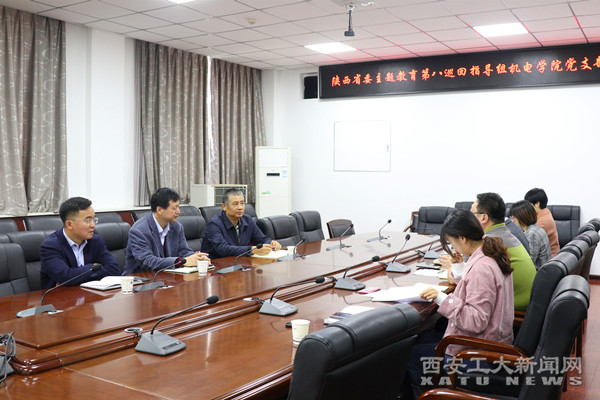 (本网讯)10月29日上午,陕西省委“不忘初心、牢记使命”主题教育第八巡回督导组联络员雷永强来机电学院开展工作督导座谈,我校党委组织部副处级组织员赵伟陪同。机电学院党委书记路金龙参加座谈会,学院全体学生党支部书记汇报近期“不忘初心、牢记使命”主题教育工作具体情况。
